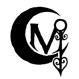 Organisational logo, depicting an elaborate "M" with a clockwork-hand edge nestled within a stylised crescent moon "C". Copyright of the Australian larp organisation "Caligo Mundi".